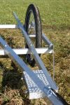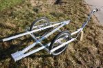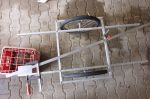 Zum einen wurde die Siebdruckplatte, die 3,5kg wog, zur Gewichtsreduzierung demontiert und anstatt dessen, für die Festigkeit in der horizontalen Ebene, eine Diagonalstrebe eingefügt, die zugleich auch als Kupplungsanschluss dient. Vielen Dank gilt hier meinem Vater, der die dazu notwendigen Winkelklötze für die Montage der Diagonalstrebe „gedreht“ hat. Außerdem ist es nun durch einen zweiten Kupplungsanschluss möglich den Anhänger bequem per Hand zu fahren. Ein Abweiser, jeweils an jeder Seite, soll vor zerstörerischen Kollisionen schützen. Die eingesparten 1,5kg durch den Einsatz der Diagonalstrebe (anstelle der Siebdruckplatte) wurden in eine abschließbare Alukiste investiert, die vorne auf dem Hänger montiert wurde.