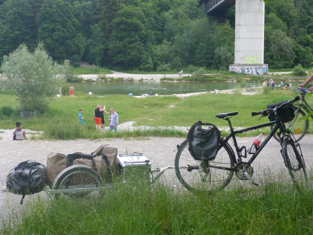 In den Pfingstferien fand auch noch eine erste größere Fahrradtour mit dem Anhänger und simulierter Ladung (Sandsack in der Alubox) statt, die entlang der Isar, richtig gut verlief. Teilweise wurde der Anhänger auf Mountain-Bike-Terrain gestestet, vorbei an engen Passagen und rauhen Untergrund, machte er eine gute Figur.