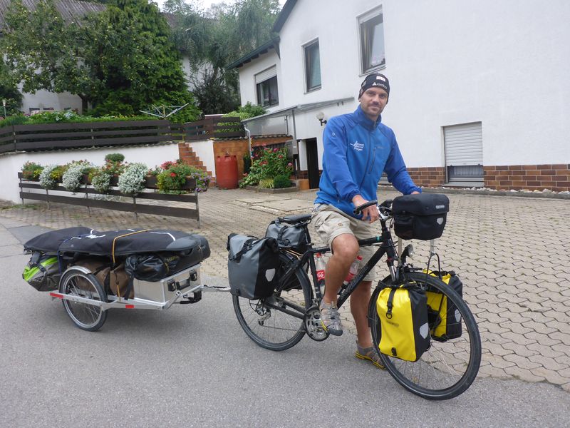 Die Abfahrt von meinem Heimatdorf Leuzdorf ist nun genau eine Woche her. Die ersten Meter waren sehr seltsam, da man eine Strecke fährt, die man von so vielen Situationen aus der Jugend kennt. Jetzt aber ist es eine Abschiedsfahrt durch das Schwabachtal. Der Weg sollte auf den nicht weit entfernten Paneuropa Radweg (Prag – Paris) führen, den ich eine Weile Richtung Westen befahren werde. Auf diesem Fernradweg liegt der Wohnort meiner Taufpaten, die ich nochmal besuchen wollte. Bei einer herzhaften Mittagsmahlzeit (vielen Dank nochmal) wurden letzte Routengespräche geführt. Nach dem zweitem Abschied an diesem Tag stellt sich ein Dauernieseln ein. Im Klang der Regentropfen auf der Jacke trete ich in die Pedale. Dem Fluß, Bibert, entlang stellen sich einige Fragen: Wird dieses Projekt mit dem schweren Anhänger klappen? – Wen werde ich alles treffen? – …