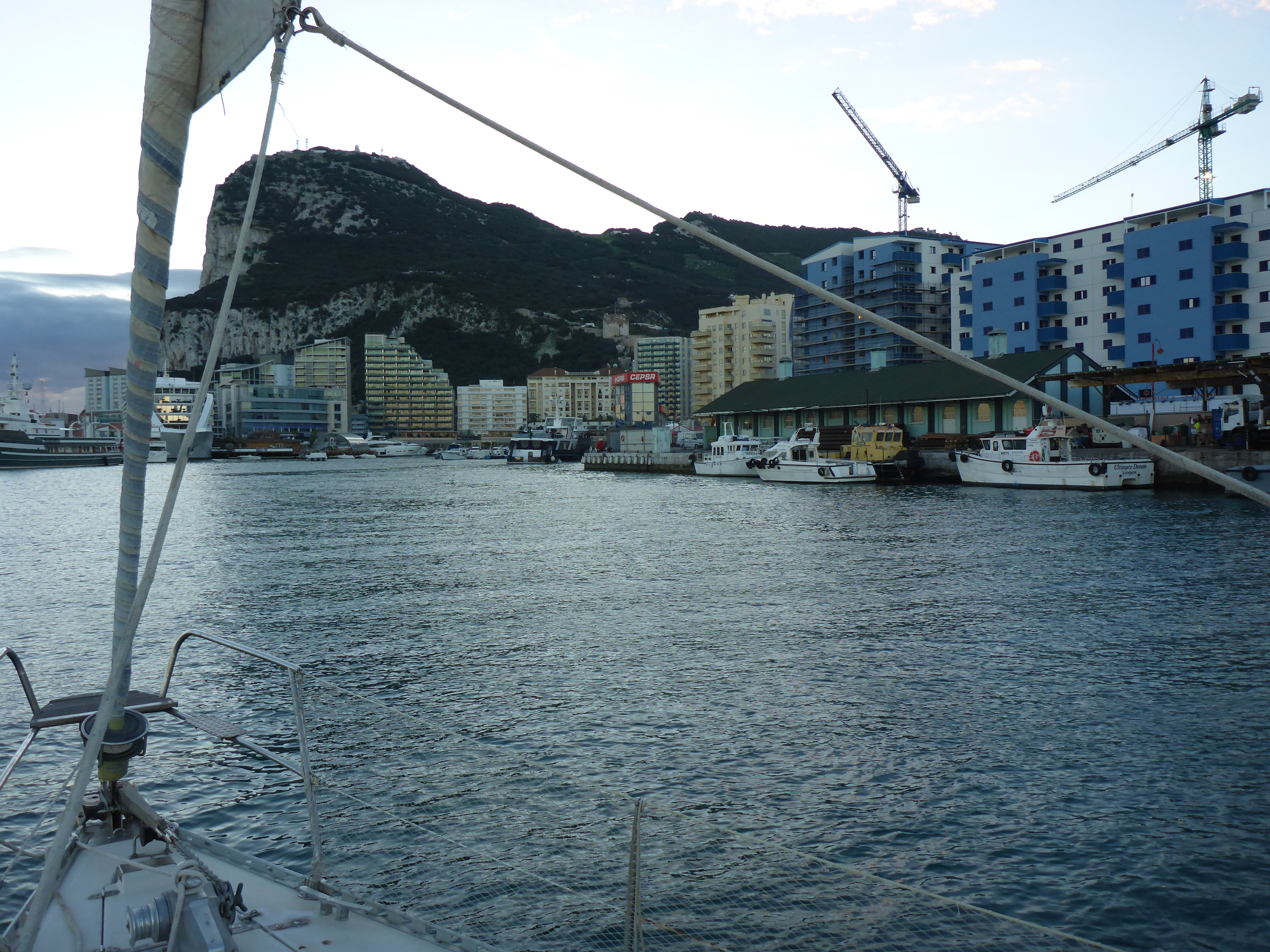 Nun geht es los! Mit dem Sonnenaufgang heißt es: Leinen los und Fender einholen. Langsam tuckern wir aus dem Hafen heraus und ich schaue auf den Hafeneingang. Dort habe ich oftmals sehnsüchtig auf ein Schiff gewartet. Wir nehmen Kurs auf Gibraltar zum Volltanken des Bootes, da der Diesel dort nur die Hälfte kostet. Mit uns verlassen noch zwei weitere Boote das spanische Festland. Auch Xander´s Boot, auf dem wir drei Tage poliert haben, sticht in See. Rainer, mein Kapitän, drückt mir nachdem wir unseren kurzen Stop in Gibraltar hinter uns haben sofort das Steuer in die Hand. Die Vorfreude auf das Kommende steigt nochmals. Wir umkurven große, ankernde Frachter, die zwischen Gibraltar und Algeciras ausharren. In der Straße von Gibraltar ist viel Verkehr und wenig Wind, sodass wir auf den Motor angwiesen sind. Nachdem wir die Schifffahrtsstraße überquert hatten, schalten wir den Autopilot ein. Mir war nicht bewusst, dass so viel Komfort auf Segelbooten herrscht.