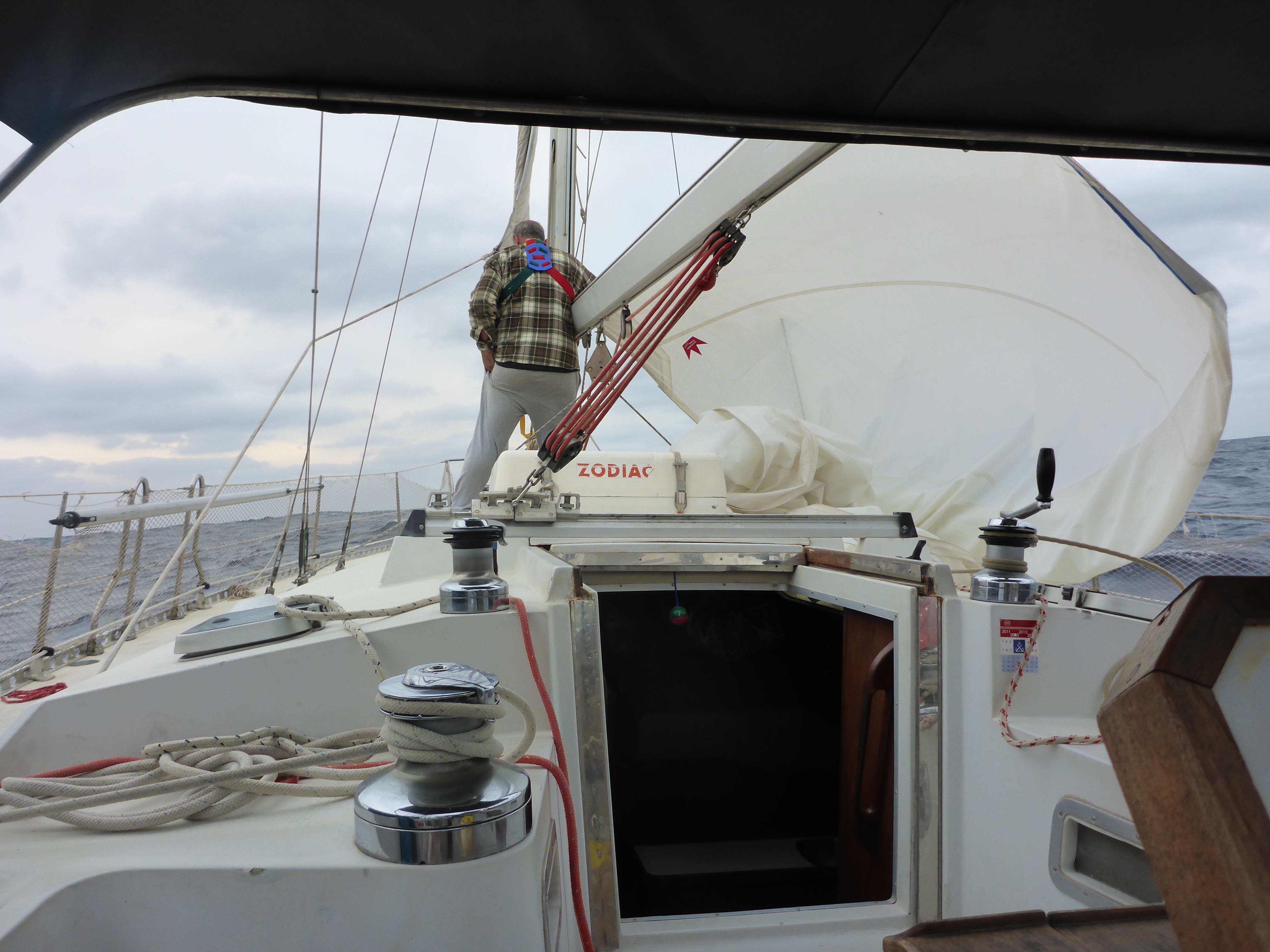 Nach einigen Stunden macht sich Hunger bemerkbar. Ein Hungergefühl, dass ich sieben Tage nicht mehr haben werde. Rainer macht Pizzabrote, die wir uns bei strahlendem Sonnenschein schmecken lassen. Da uns das nicht genügt, mache ich unter Deck die zweite Ration – ein folgenschweres Unterfangen, wie sich herausstellen wird. Nach kurzer Dauer fliegen die Pizzabrötchen über Board und die Seekrankheit mit oraler Diarrhö hat begonnen! Rainer rät mir an Deck zu bleiben, da ich hier den Horizont sehe und die Übelkeit erträglicher sein soll. Insgesamt verbringe ich 4 Tage und Nächte an Deck. Am zweiten Tag nehme ich Tabletten gegen die Seekrankheit ein, gegen die ich mich lange gewehrt habe. Diese verhelfen mir dazu, nicht mehr erbrechen zu müssen. Die Übelkeit und das Unwohlsein bleiben dennoch. Ich fühle mich von Tag zu Tag schwächer. Das Dasein besteht für mich auf dem Schiff hauptsächlich aus Liegen und Sitzen und der Kreislauf geht in den Keller. Die Imobilität bereitet mir zu schaffen. Insgesamt lege ich in den 7 Tagen schätzungsweise 150m zurück – der Weg zur Reling ist nicht weit.