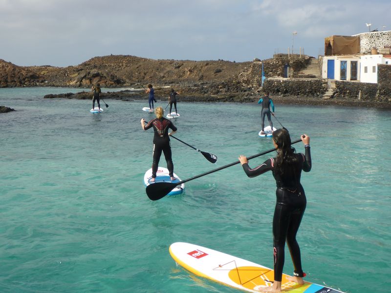 In der Zeit vor meinem Abflug auf das spanische Festland nach Tarifa bin ich bei einigen SUP-Kursen (Stand UP Paddeling) dabei. Die unbewohnte, benachbarte Insel Lobos bietet dafür sehr schöne Buchten um erste Schritte mit dem Brett und Paddel zu machen. Außerdem bleibt Zeit